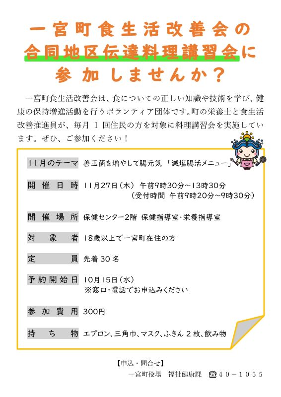 一宮町食生活改善会 11月地区伝達料理講習会のご案内