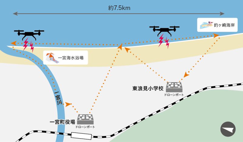 津波避難広報システムは、津波情報が発表された際、一宮町役場および東浪見小学校の屋上に設置されたドローンポート(離着陸用格納設備)から、ドローンが自動的に発進し、上空からサーファーや海水浴客、周辺住民に対して避難指示を伝達します。