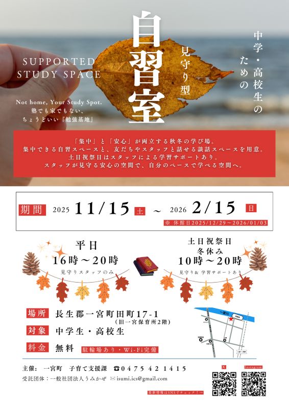 中学生・高校生を対象に、秋冬の受験シーズンに学力向上や居場所づくりを目的として、臨時の自習室・談話室を開設します。暖房・Wi-Fiを完備していますので、ぜひご利用ください。